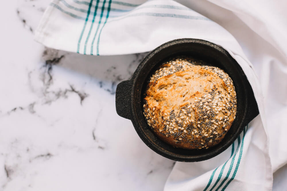 Garnek żeliwny to prawdziwy klasyk wypieku chleba. Ciężki, solidny, doskonale przewodzi ciepło i trzyma temperaturę przez cały czas pieczenia. Pozwala to na uzyskanie chrupiącej skórki i dobrze wyrośniętego bochenka nawet z dużej ilości ciasta czy z dodatkiem ziaren słonecznika.