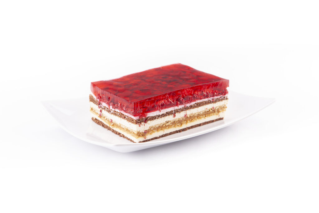 Wilgotny kakaowy biszkopt przełożony aksamitnym kremem twarożkowym, słodką masą krówkową, chrupiącymi herbatnikami oraz soczystymi malinami zatopionymi w galaretce. Każda warstwa to połączenie kontrastujących smaków i tekstur – deser, który zachwyca zarówno smakiem, jak i wyglądem.