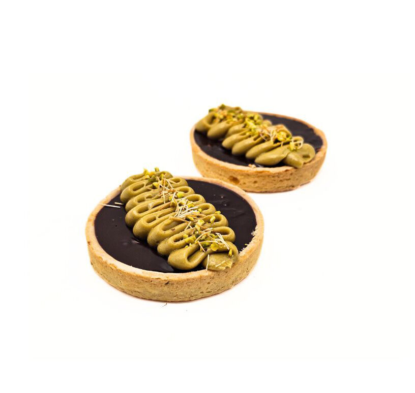 Migdałowy, kruchy korpus wypełniony aksamitnym kremem pistacjowym i złocistym ciastem kataifi, polany intensywnym ganache z deserowej czekolady. Całość wykończona dekoracyjnym kremem pistacjowym, chrupiącą pistacją i ciastem kataifi – deser dla prawdziwych miłośników eleganckich słodkości.