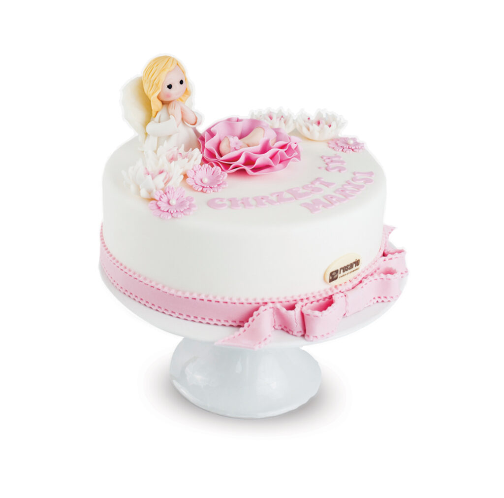 Delikatny tort komunijny w białej tonacji z subtelnymi, różowymi akcentami. Dekorowany figurką aniołka w modlitwie oraz kwiatami z masy cukrowej, symbolizuje czystość, niewinność i duchową opiekę. Brzeg tortu zdobi elegancka różowa kokarda, a powierzchnię można spersonalizować, dodając imię dziecka oraz dedykację.