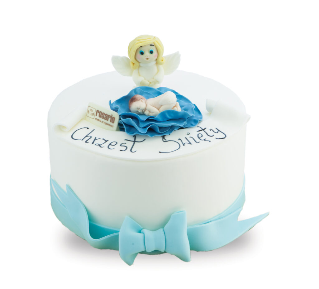 Delikatny tort na Chrzest Święty, udekorowany figurką aniołka oraz maleńkim niemowlęciem ułożonym na niebieskim kwiecie z masy cukrowej. Utrzymany w białej kolorystyce z błękitnymi akcentami, symbolizuje czystość, opiekę i błogosławieństwo. Dodatkową ozdobą jest elegancka kokarda na brzegu tortu oraz ręcznie wykonany napis „Chrzest Święty”.