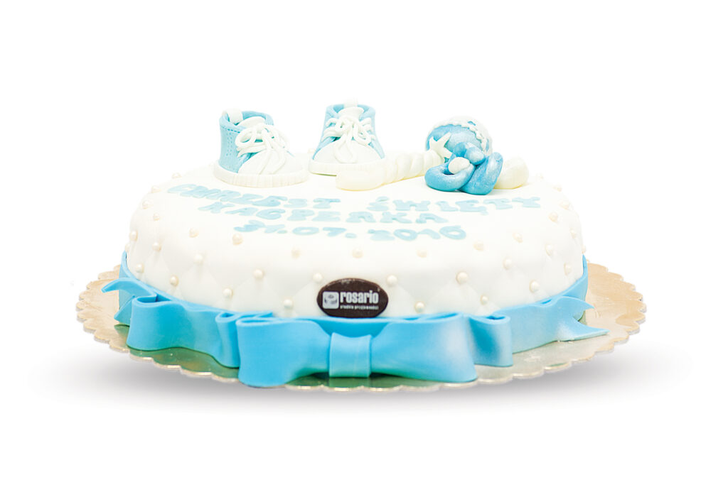 Uroczy tort na Chrzest Święty, utrzymany w białej tonacji z błękitnymi akcentami. Dekorację tworzą maleńkie buciki, grzechotka i smoczek z masy cukrowej – symbole nawiązujące do dzieciństwa i niewinności. Brzeg tortu zdobi elegancka, niebieska kokarda, a całość można spersonalizować, dodając imię dziecka i datę uroczystości.