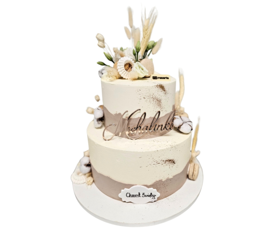 Dwupiętrowy tort w nowoczesnym stylu, utrzymany w naturalnej, stonowanej kolorystyce beżu i bieli. Dekorowany kwiatami, kłosami zbóż i subtelnymi akcentami w stylu boho, które nadają mu lekkości i elegancji. Personalizowany napis z imieniem dziecka oraz dedykacją sprawia, że tort staje się wyjątkową pamiątką tej ważnej uroczystości.