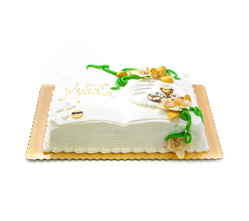 Elegancki tort w kształcie otwartej księgi, przygotowany specjalnie na uroczystość Pierwszej Komunii Świętej. Utrzymany w białej kolorystyce, ozdobiony złotymi i zielonymi akcentami, kwiatami oraz hostią – symbolami tego wyjątkowego dnia.