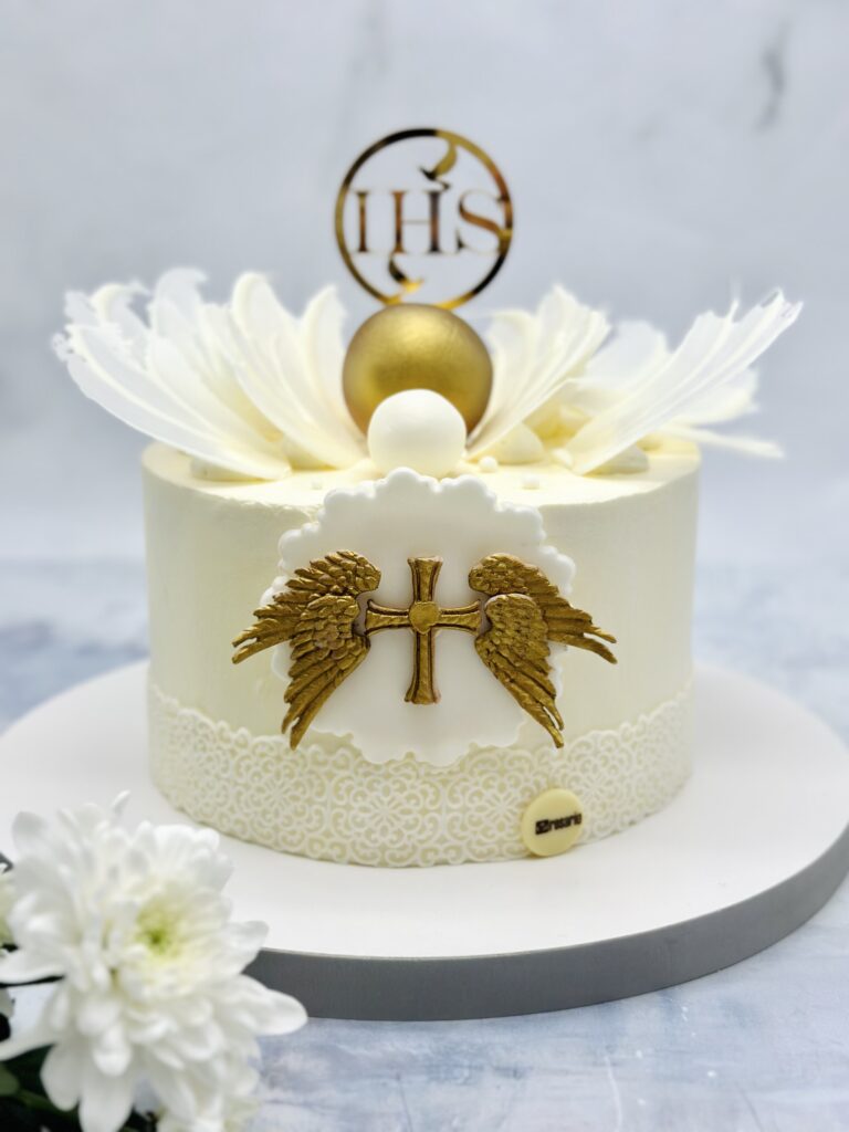Wyjątkowy tort komunijny o eleganckim, minimalistycznym designie. Utrzymany w białej kolorystyce, udekorowany złotymi detalami – symbolem krzyża z anielskimi skrzydłami oraz topperem IHS. Całość dopełniają delikatne dekoracje przypominające białe pióra oraz złote kule, nadające mu lekkości i nowoczesnego charakteru.