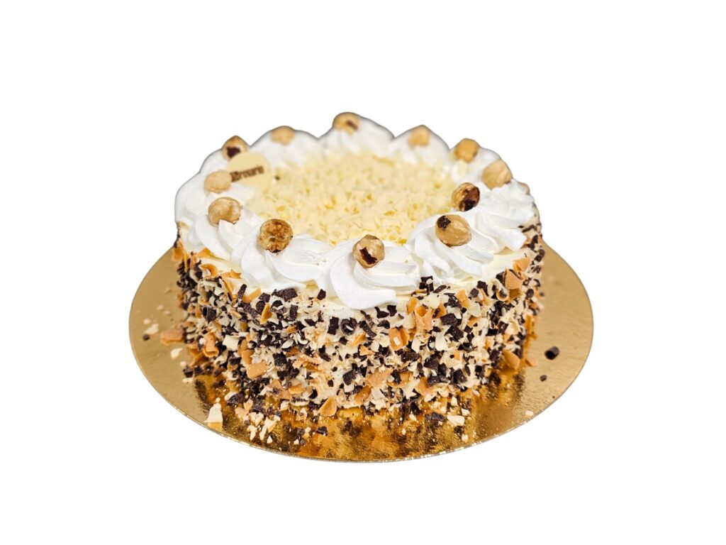 Czekoladowe biszkopty przełożone delikatną bitą śmietaną z dodatkiem białej czekolady. Całość obsypana czekoladową korą.