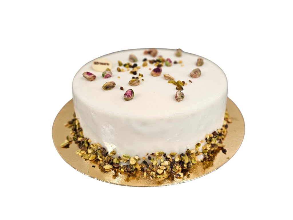 Wyrafinowana kompozycja smakowa łącząca delikatny waniliowy biszkopt z chrupkością białej czekolady, świeżością malinowej żelki oraz kremu z prażonych pistacji na bazie śmietanki i mascarpone.