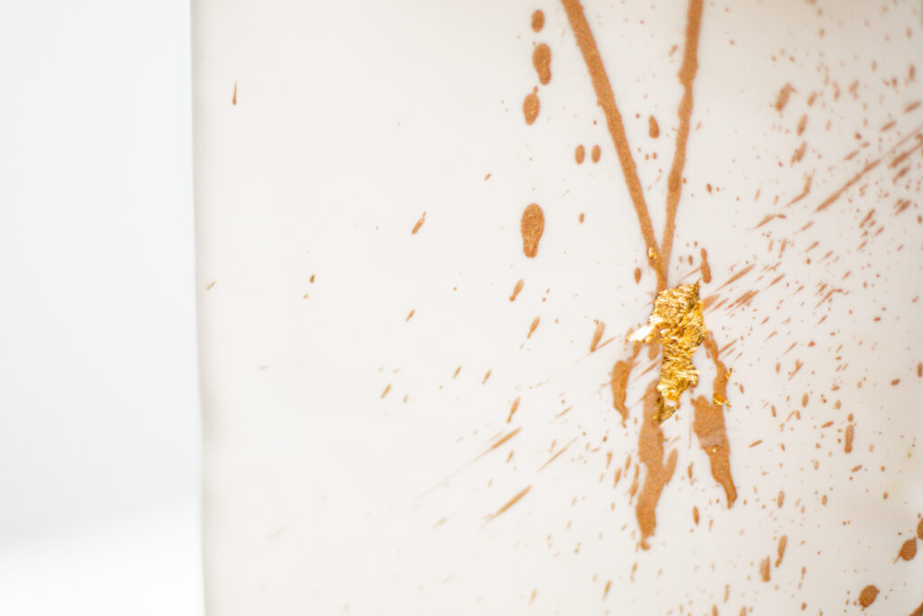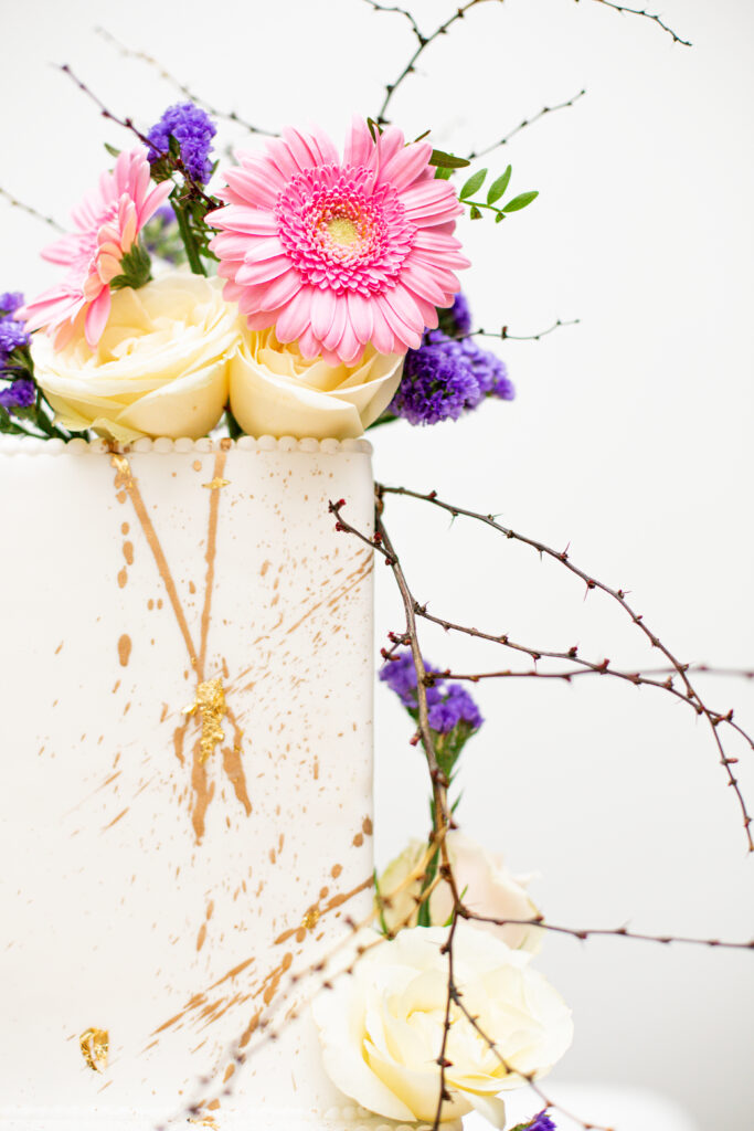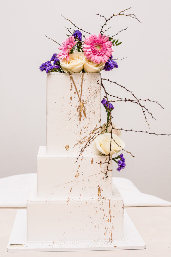 Wyjątkowy tort weselny o geometrycznej, kwadratowej formie, która wyróżnia go spośród klasycznych propozycji. Minimalistyczna, biała powierzchnia została ozdobiona złotymi akcentami w formie artystycznych smug, co nadaje mu nowoczesny i odważny charakter. Całość dopełniają kolorowe kwiaty i naturalne gałązki, wprowadzając lekkość i swobodę. To idealna propozycja dla Par Młodych poszukujących nietypowego, designerskiego tortu.
